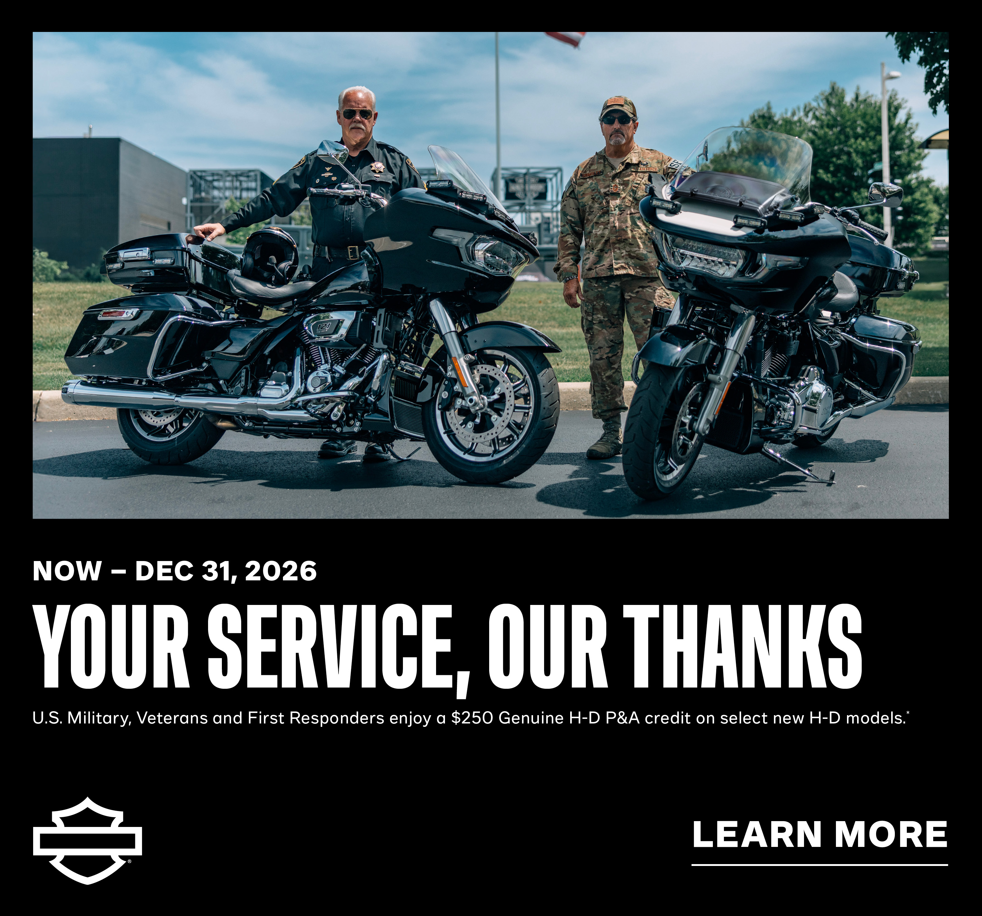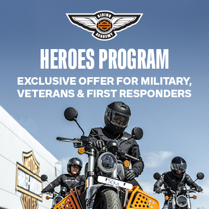 We are excited to honor those who serve our country and local communities with the new Harley-Davidson® Riding Academy Heroes Program. As of February 1, 2026, all U.S. active military, veterans first responders and their spouses can receive $100 off the published price of any eligible H-D Riding Academy license waiver course at a participating dealership. Classes must be completed by December 31, 2026.